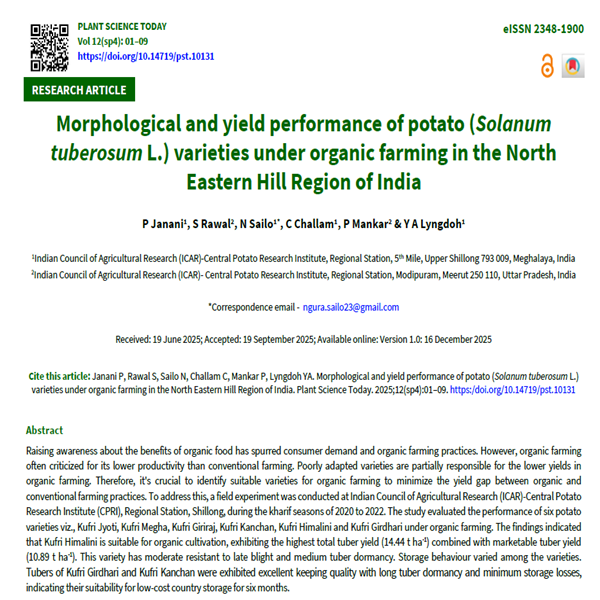 Research Institute (CPRI), Regional Station, Shillong, during the kharif seasons of 2020 to 2022. The study evaluated the performance of six potato varieties viz., Kufri Jyoti, Kufri Megha, Kufri Giriraj, Kufri Kanchan, Kufri Himalini and Kufri Girdhari under organic farming. The findings indicated that Kufri Himalini is suitable for organic cultivation, exhibiting the highest total tuber yield (14.44 t ha-1) combined with marketable tuber yield (10.89 t ha-1). This variety has moderate resistant to late blight and medium tuber dormancy. Storage behaviour varied among the varieties.