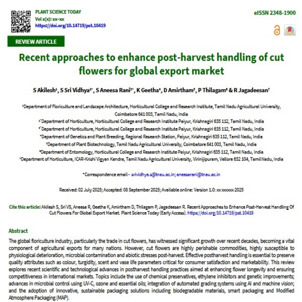 The global floriculture industry, particularly the trade in cut flowers, has witnessed significant growth over recent decades, becoming a vital component of agricultural exports for many nations. However, cut flowers are highly perishable commodities, highly susceptible to physiological deterioration, microbial contamination and abiotic stresses post-harvest. Effective postharvest handling is essential to preserve quality attributes such as colour, turgidity, scent and vase life parameters critical for consumer satisfaction and marketability. This review explores recent scientific and technological advances in postharvest handling practices aimed at enhancing flower longevity and ensuring competitiveness in international markets. Topics include the use of chemical preservatives, ethylene inhibitors and genetic improvements; advances in microbial control using UV-C, ozone and essential oils; integration of automated grading systems using AI and machine vision; and the adoption of innovative, sustainable packaging solutions including biodegradable materials, smart packaging and Modified Atmosphere Packaging (MAP).