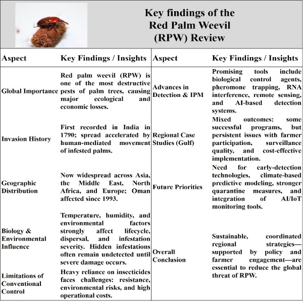 The red palm weevil (Rhynchophorus ferrugineus (Olivier)) is one of the most destructive pests of palm trees worldwide, with severe ecological and economic impacts. This review synthesizes current knowledge on its invasion history, global distribution, host range, biology and damage mechanisms, while assessing advances in detection, monitoring and integrated pest management (IPM). Since its first record in India in 1790, human-mediated trade of infested palms has facilitated its spread across Asia, the Middle East, North Africa and Europe, with Oman reporting infestations since 1993. Temperature, humidity and other environmental factors strongly influence its lifecycle and dispersal, often enabling hidden infestations that remain undetected until irreversible damage occurs. Conventional management approaches primarily insecticides face limitations due to resistance, environmental risks and high costs. Recent advances in eco-friendly biological agents, pheromone trapping, RNA interference, remote sensing and artificial intelligence (AI) offer promising pathways to strengthen IPM frameworks. Case studies in the Gulf highlight both successes and persistent challenges, particularly in farmer participation, surveillance systems and cost-effective implementation. Future directions should prioritize reliable early-detection technologies, predictive modeling of pest distribution under climate change, enhanced quarantine measures and the integration of AI- and Internet of Things (IoT)-based monitoring tools. A coordinated regional strategy, supported by sustainable policies and farmer engagement, is critical to reducing the global threat of red palm weevil (RPW).