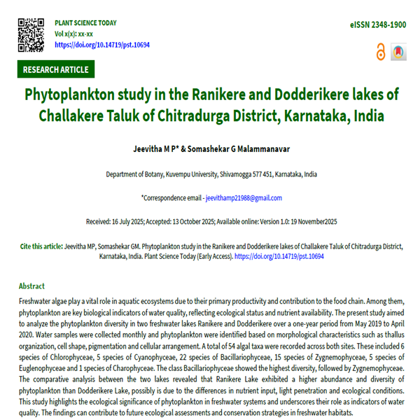 Freshwater algae play a vital role in aquatic ecosystems due to their primary productivity and contribution to the food chain. Among them, phytoplankton are key biological indicators of water quality, reflecting ecological status and nutrient availability. The present study aimed to analyze the phytoplankton diversity in two freshwater lakes Ranikere and Dodderikere over a one-year period from May 2019 to April 2020. Water samples were collected monthly and phytoplankton were identified based on morphological characteristics such as thallus organization, cell shape, pigmentation and cellular arrangement. A total of 54 algal taxa were recorded across both sites. These included 6 species of Chlorophyceae, 5 species of Cyanophyceae, 22 species of Bacillariophyceae, 15 species of Zygnemophyceae, 5 species of Euglenophyceae and 1 species of Charophyceae. The class Bacillariophyceae showed the highest diversity, followed by Zygnemophyceae. The comparative analysis between the two lakes revealed that Ranikere Lake exhibited a higher abundance and diversity of phytoplankton than Dodderikere Lake, possibly is due to the differences in nutrient input, light penetration and ecological conditions. This study highlights the ecological significance of phytoplankton in freshwater systems and underscores their role as indicators of water quality. The findings can contribute to future ecological assessments and conservation strategies in freshwater habitats.