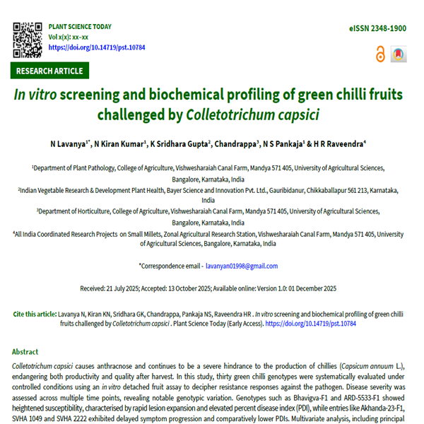 Colletotrichum capsici causes anthracnose and continues to be a severe hindrance to the production of chillies (Capsicum annuum L.), endangering both productivity and quality after harvest. In this study, thirty green chilli genotypes were systematically evaluated under controlled conditions using an in vitro detached fruit assay to decipher resistance responses against the pathogen. Disease severity was assessed across multiple time points, revealing notable genotypic variation. Genotypes such as Bhavigva-F1 and ARD-5533-F1 showed heightened susceptibility, characterised by rapid lesion expansion and elevated percent disease index (PDI), while entries like Akhanda-23-F1, SVHA 1049 and SVHA 2222 exhibited delayed symptom progression and comparatively lower PDIs. Multivariate analysis, including principal component analysis (PCA), further highlighted the distinct pathological profiling of tested genotypes. Complementary biochemical profiling at four days post-inoculation (DPI) identified significant differences in the accumulation of total phenols, soluble sugars, reducing sugars and proteins. Notably, moderately susceptible genotypes accumulated higher phenolic and protein content, which correlated negatively with disease severity. Similarly, total soluble solids (TSS) and total reducing sugars (TRS) also showed variation among the genotypes. Together, these insights not only affirm the existence of valuable genetic variability for anthracnose resistance in chilli but also emphasise the utility of integrating biochemical markers with phenotypic screening.