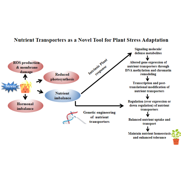 Nutrient transporters are integral membrane proteins that regulate the uptake, translocation and redistribution of essential nutrients in plants. Under abiotic and biotic stresses, their activity plays a pivotal role in maintaining ionic homeostasis, osmotic balance and stress signalling. This review explores how nutrient transporters respond to environmental cues and mediate stress tolerance. For instance, potassium transporters mediate stomatal closure under drought, maintain Na+/K+ homeostasis under salinity and facilitate structural adaptations such as adventitious root and aerenchyma formation under flooding. Similarly, plasma membrane H+-ATPase maintains membrane integrity under heat stress, while metal transporters regulate the uptake and detoxification of heavy metals. In response to biotic stress, calcium and silicon transporters enhance structural defences and stimulate the biosynthesis of secondary metabolites. Collectively, these mechanisms underscore the central role of nutrient transporters in plants under stress and highlight their potential as targets for engineering crops with improved nutrient use efficiency and stress tolerance.