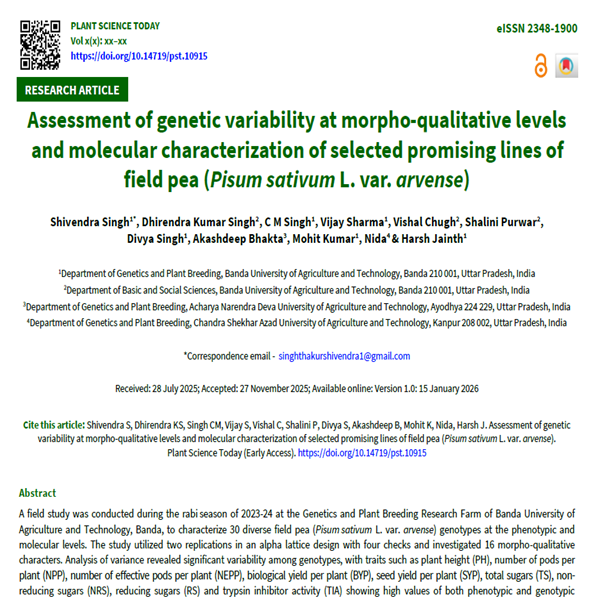 A field study was conducted during the rabi season of 2023-24 at the Genetics and Plant Breeding Research Farm of Banda University of Agriculture and Technology, Banda, to characterize 30 diverse field pea (Pisum sativum L. var. arvense) genotypes at the phenotypic and molecular levels. The study utilized two replications in an alpha lattice design with four checks and investigated 16 morpho-qualitative characters. Analysis of variance revealed significant variability among genotypes, with traits such as plant height (PH), number of pods per plant (NPP), number of effective pods per plant (NEPP), biological yield per plant (BYP), seed yield per plant (SYP), total sugars (TS), non-reducing sugars (NRS), reducing sugars (RS) and trypsin inhibitor activity (TIA) showing high values of both phenotypic and genotypic coefficients of variation (PCV and GCV). These traits also exhibited high heritability and genetic advance as a percent of the mean (GAM), indicating additive gene effects and suggesting their suitability for effective selection. Eighteen field pea genotypes were molecularly characterized using 18 polymorphic SSR markers, revealing 36 alleles and indicating moderate genetic diversity. Primer AA-446 was the most informative, while AD-249 was the least informative. Cluster analysis grouped the genotypes into three distinct clusters and Principal Coordinate Analysis (PCoA) captured 43.36 % of the total genetic variation across the first two axes. These findings confirm sufficient diversity among genotypes for effective selection and future breeding programmes.