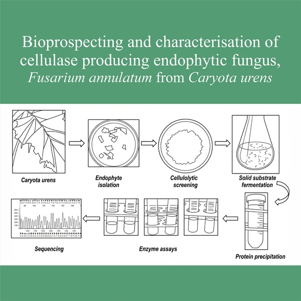 Cellulases are a complex system of three enzymes, including endoglucanases, exoglucanases and β-glucosidases, that work together in synergic fashion to degrade lignocellulosic biomass into simple sugars. Despite their enormous applications, they imply high production costs, which represent a significant bottleneck limiting the industrial utilisation. This study therefore investigated the purification and characterisation of cellulase producing endophytic fungal strain, Fusarium annulatum, isolated from Caryota urens (Jaggery palm), identified by morphological characteristics and ITS sequencing. Crude cellulase enzyme was obtained from F. annulatum solid-state fermentation and partial purification of the enzyme was achieved through ammonium sulphate precipitation and dialysis. The partially purified enzyme sample exhibited significant activities of endoglucanase (1.2358 ± 0.0055 IU/mL), β-glucosidase (0.708 0.017 IU/mL) and cellobiohydrolase (0.244 ± 0.019 IU/mL). The filter paper assay of the partially purified enzyme demonstrated significant cellulase activity of 0.7406 ± 0.0258 IU/mL. The optimal pH and temperature of the partially purified enzyme were determined to be 6.0 and 50.0 °C, respectively. These results demonstrate the cellulase producing capacity of F. annulatum, anticipating its industrial production for various purposes, such as biomass conversion and biofuel production. This is one of the first reports of cellulase activity by F. annulatum.