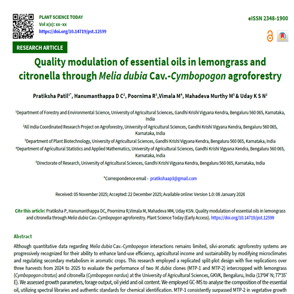 Although quantitative data regarding Melia dubia Cav.-Cymbopogon interactions remains limited, silvi-aromatic agroforestry systems are progressively recognized for their ability to enhance land-use efficiency, agricultural income and sustainability by modifying microclimates and regulating secondary metabolism in aromatic crops. This research employed a replicated split-plot design with five replications over three harvests from 2024 to 2025 to evaluate the performance of two M. dubia clones (MTP-1 and MTP-2) intercropped with lemongrass (Cymbopogon citratus) and citronella (Cymbopogon nardus) at the University of Agricultural Sciences, GKVK, Bengaluru, India (13°04′ N; 77°35′ E). We assessed growth parameters, forage output, oil yield and oil content. We employed GC-MS to analyse the composition of the essential oil, utilizing spectral libraries and authentic standards for chemical identification. MTP-1 consistently surpassed MTP-2 in vegetative growth and biomass production during all harvests. At the third harvest, plants cultivated with MTP-1 measured 138.65 cm in height and produced 135.65 tillers. Plants cultivated with MTP-2 attained a height of only 88.15 cm and produced 67.75 tillers. The MTP-1 system produced greater quantities of fresh and dried herbage and oil (44.37 vs. 29.96 kg ha-1), with the MTP-1 and lemongrass combination yielding the maximum oil output (46.36 kg ha-1). The MTP-2 × citronella combination had a higher oil content (2.12 % compared to 1.76 %), indicating a trade-off between biomass accumulation and oil concentration. In citronella oil, shady conditions decreased citronellal while increasing geranyl acetate. The citral (geranial + neral) concentration in lemongrass oil was increased. Agroforestry systems with M. dubia enhance growth and oil yield while altering the composition of essential oils. This renders them beneficial for both the environment and the economy and they can be utilized to achieve market and quality objectives.