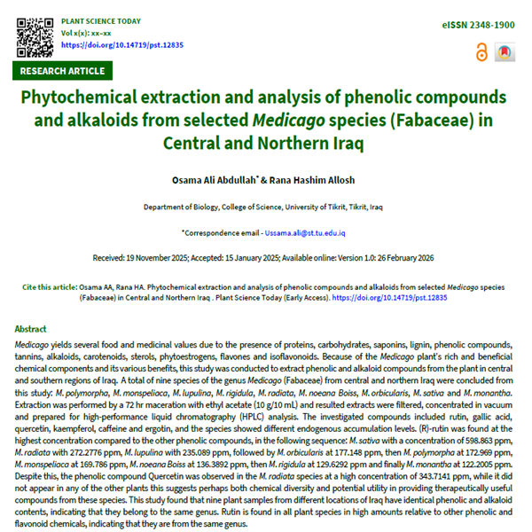 Phytochemical extraction and analysis of phenolic compounds and alkaloids from selected Medicago species (Fabaceae) in Central and Northern Iraq