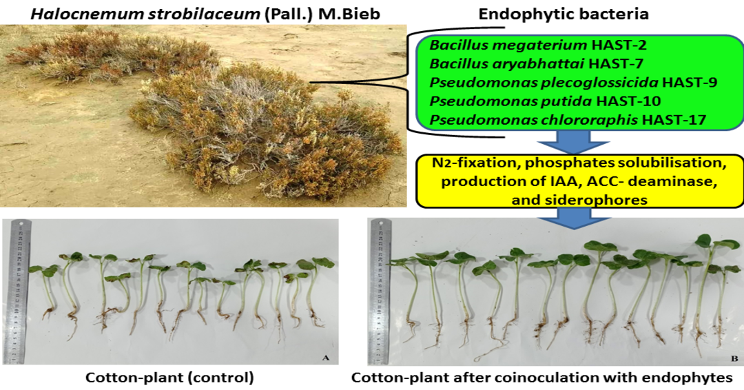 Halocnemum strobilaceum (Pall.) M.Bieb. is a halophyte desert plant. The plant is known for its antioxidant, antimicrobial, insecticidal and phytoremediation properties. Halocnemum strobilaceum grows in severe salinity and drought conditions and its’ survival can be associated with activity of endophytic bacteria. The aim of the research was to reveal and study plant growth-promoting endophytic bacteria isolated from Halocnemum strobilaceum (Pall.) M.Bieb. The plants were collected from Kyzylkum desert in Uzbekistan. The endophytic bacteria were isolated from Halocnemum strobilaceum (Pall.) M.Bieb. tissues and screened for cotton (Gossypium hirsutum L.) growth-promoting activity. As a result the most active isolates HAST-2, HAST-7, HAST-9, HAST-10 and HAST-17 were selected. The cotton seeds’ inoculation with these bacterial isolates resulted in significant improvement of seeds germination, root and shoot length, and fresh plant weight due to their ability to fix nitrogen, produce indole-3-acetic acid (IAA), 1-aminocyclopropane-1-carboxylate (ACC) deaminase, siderophores and solubilize phosphates. The chosen isolates were identified using 16S rRNA gene analysis and registered in GenBank (NCBI) as Bacillus megaterium HAST-2, Bacillus aryabhattai HAST-7, Pseudomonas plecoglossicida HAST-9, Pseudomonas putida HAST-10 and Pseudomonas chlororaphis HAST-17. These strains can be used as bio-inoculants to improve the growth of cotton and other crops.