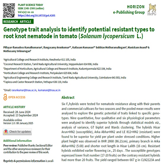 Six F1 hybrids were tested for nematode resistance along with their parents and commercial cultivars for two seasons and the pooled mean results were analysed to explore the genetic potential of traits linked to specific genotypes. Nine quantitative, four qualitative and six physiological parameters were analyzed to identify superior hybrids through statistical models viz., analysis of variance, GE biplot and Wards clustering. The hybrids Hisar Arun×HN2 (susceptible), Arka Abha×HN2 and LE 812×HN2 (resistant) were found to be superior for yield per plant under stressed conditions. Higher plant height was observed in IIHR 2868 (86.21cm), primary branch in Arka Abha×HN2 (5.68) and shorter root length in Hisar Lalith (16 cm). Resistant hybrids exhibited earlier flowering i.e., 25 days and less fruit number. The susceptible genotypes expressed lower fruit number (17-20 fruits) on the contrary resistant hybrids had more than 20 fruits. The yield ranged between 667 g in CLN2123A to 1189 g in Hisar Arun×HN2. Under stressed conditions, the resistant hybrids Arka Abha×HN2 and LE 812×HN2 produced yields of 1169 g and 1153 g, respectively. Genotype Trait Biplot revealed that the PC1 and PC2 had contributed 70 % to the total variance and positive contributions to parents and hybrids were capped. The hybrids LE 812×HN2 and Arka Abha×HN2 can be well utilized in root knot nematode infested fields. The contribution of parents and its hybrids, associated traits and their interrelationships provide new dimension for the breeders to select trait specific parents and hybrids for crop improvement programs.