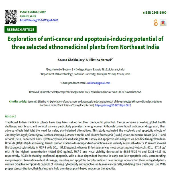 Traditional Indian medicinal plants have long been valued for their therapeutic potential. Cancer remains a leading global health challenge, with breast and cervical cancers particularly prevalent among women. Although conventional anticancer drugs exist, their adverse effects highlight the need for safer, plant-derived alternatives. This study evaluated the cytotoxic and apoptotic effects of Zanthoxylum oxyphyllum Edgew, Rotheca serrata (L.) Steane & Mabb. and Blumea lanceolaria (Roxb.) Druce on human breast (MCF-7) and cervical (HeLa) cancer cell lines. Cytotoxicity was assessed using the MTT assay and apoptosis was analyzed via Acridine Orange/Ethidium Bromide (AO/Et-Br) dual staining. Results demonstrated a dose-dependent reduction in cell viability across all extracts. R. serrata showed the strongest cytotoxicity in MCF-7 cells (IC₅₀ =54.53 µg/mL), whereas B. lanceolaria was most potent against HeLa cells (IC₅₀ =57.14 µg/mL). At the highest concentration tested (100 µg/mL), MCF-7 and HeLa viability decreased to 36.84-45.22 % and 32.21-44.13 %, respectively. AO/Et-Br staining confirmed apoptosis, with a dose-dependent increase in early and late apoptotic cells, corroborating morphological observations of cell shrinkage, rounding and apoptotic body formation. These findings indicate that the investigated plants contain bioactive compounds capable of inducing cytotoxicity and apoptosis in human cancer cells, validating their traditional use. With proper standardization, their leaf extracts hold promise as plant-based anticancer therapeutics.