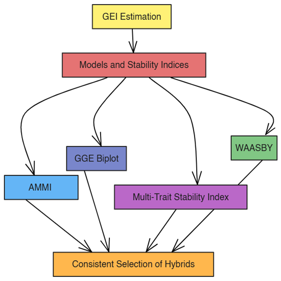 Genotype-environment interaction (GEI) plays a critical role in genotype adaptation, making it essential for selecting stable, widely adapted genotypes for cultivation. GEI estimation enables the identification of genotypes that perform consistently across diverse conditions. Models and stability indices derived from fixed-effect and/or mixed-effect models are frequently utilized for analyzing GEI and selecting genotypes. In this study, thirty hybrids developed through a diallele fashion, along with two checks, were grown across three environments during kharif 2023. Analysis of variance revealed significant contributions from the environment and GEI, alongside genotypic effects for eight traits studied, covering flowering, plant architecture and yield. Plot yield (t/ha) was subjected to additive main effects and multiplicative interaction effects (AMMI) analysis to study the stability and genotype interactions with the environment. The first two principal components (PCs) of AMMI analysis explained 69.1% and 30.9% of the total variation, respectively, identifying stable hybrids such as MH-TN-15 and MH-TN-30. The Genotype-genotype×environment (GGE) biplot further highlighted the adaptability and stability of all the genotypes, with the first two PCs explaining 86.11% of the G+GE variation. A multi-trait stability index (MTSI) was employed to select stable and high-performing genotypes across multiple traits. A comprehensive analysis of all the genotypes through various indices showed that hybrids MH-TN-15 and MH-TN-30 were consistently selected as stable and high-yielding genotypes across all indices, demonstrating higher yields than check hybrids and being identified for cultivation. These methods underscore the importance of combining yield and stability metrics for effective genotype selection in varied environments.