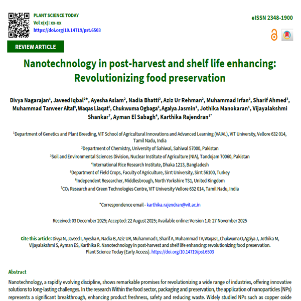 Nanotechnology, a rapidly evolving discipline, shows remarkable promises for revolutionizing a wide range of industries, offering innovative solutions to long-lasting challenges. In the research Within the food sector, packaging and preservation, the application of nanoparticles (NPs) represents a significant breakthrough, enhancing product freshness, safety and reducing waste. Widely studied NPs such as copper oxide (CuO), silver (Ag), magnesium oxide (MgO), titanium dioxide (TiO2), silicon dioxide (SiO2), zinc oxide (ZnO), carbon dots, graphene, chitosan and mesoporous particles have demonstrated remarkable potential in extending product’s freshness and reduce safety risks by inhibiting microbial growth and lowering spoilage in tomato, broccoli, spinach and other green vegetables.  This review highlights the utilization of NPs, including Ag, ZnO, TiO2, SiO2, nanoclay and nanochitosan as well as nanoencapsulation techniques, in food systems. Furthermore, it explores how nanotechnology can revolutionize food packaging and preservation by enabling more effective, efficient and environmentally sustainable practices, ultimately contributing to a greener and more secure global food supply chain.