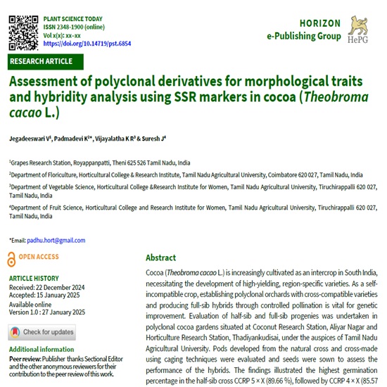 Cocoa (Theobroma cacao L.) is increasingly cultivated as an intercrop in South India, necessitating the development of high-yielding, region-specific varieties. As a self-incompatible crop, establishing polyclonal orchards with cross-compatible varieties and producing full-sib hybrids through controlled pollination is vital for genetic improvement. Evaluation of half-sib and full-sib progenies was undertaken in polyclonal cocoa gardens situated at Coconut Research Station, Aliyar Nagar and Horticulture Research Station, Thadiyankudisai, under the auspices of Tamil Nadu Agricultural University. Pods developed from the natural cross and cross-made using caging techniques were evaluated, and seeds were sown to assess the performance of the hybrids. The findings illustrated the highest germination percentage in the half-sib cross CCRP 5 × X (89.66 %), followed by CCRP 4 × X (85.57 %). The highest value for plant morphological characters like plant height (2.11 m), stem girth (15.7 cm) and jorquette height (1.58 m) was recorded in CCRP 5 × X. Among the full-sib progenies, the highest germination percentage (86.1) was recorded by FS 17 (CCRP 3 × CCRP 5), followed by FS 18 (CCRP 5 × CCRP 3) (81.8). The hybridity of the seedlings was tested using SSR markers, which confirmed that out of 26 full-sib crosses, 16 exhibited a heterozygous nature. These findings demonstrate the potential of selected progenies to serve as valuable genetic resources for breeding programs aimed at enhancing cocoa productivity and sustainability in South India.