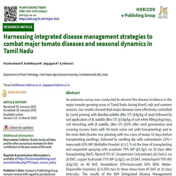An extensive survey was conducted to observe the disease incidence in the major tomato-growing areas of Tamil Nadu during kharif, rabi and summer seasons. Our results showed that major diseases were effectively controlled by (seed priming with Bacillus subtilis (Bbv 57) @4g/kg of seed followed by soil application of B. subtilis (Bbv 57) @10g/kg of soil while filling plug trays, soil drenching with B. subtilis, (Bbv 57) @5% after seed germination and covering nursery beds with 50-mesh nylon net until transplanting) and in the main field (border row planting with two rows of maize 15 days before transplanting seedlings, followed by seedling dip with carbendazim 12% + mancozeb 63% WP (Wettable Powder) @ 0.1 % at the time of transplanting and sequential spraying with acephate 75% WP @1.5g/L on 10 days after transplanting (DAT), fipronil 5% SC (Suspension Concentrate) @1.5mL/L on 20 DAT, copper hydroxide 77% WP (2.0g/L) on 25 DAT, imidacloprid 70% WG @2g/15L on 40 DAT, fenamidone 10%+mancozeb 50% WDG (Water- Dispersible Granules) @ 0.25% two to three times from 45 DAT at 10 days intervals). The results of the IDM (Integrated Disease Management) experiment revealed minimum disease severity for damping off (3.95%) fusarium wilt (8.69%), early blight (5.66%), tomato leaf curl virus (10.56%) and spotted wilt virus (10.77%) compared to the control. The developed IDM module was tested and verified in the farmer’s fields and the farmer's practice and control were compared confirming the IDM module as superior. Such an approach could also benefit prolonged tomato production and high economic returns.