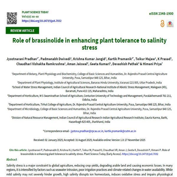Salinity stress is a major constraint to global agriculture, reducing crop yields, degrading arable land and causing economic losses. In many regions, it is intensified by factors such as seawater intrusion, poor irrigation practices and climate-related changes in water availability. While mild salinity may not severely hinder growth, high salinity disrupts ion homeostasis, induces oxidative stress and impairs physiological processes including water and nutrient transport, leading to stunted growth and reduced biomass. Brassinolide (BL), a naturally occurring plant steroid hormone, plays a pivotal role in mitigating salinity stress by regulating ion balance, enhancing antioxidant defense systems, modulating stress-responsive gene expression (e.g., ion transporters, antioxidant enzymes) and promoting growth and development. Its exogenous application through foliar sprays, seed priming or soil treatments has shown promise in improving salt tolerance. This review outlines the mechanisms of salinity stress in plants and highlights the role of BL in alleviating its effects, with emphasis on signalling pathways, ion homeostasis, regulation of Na/H antiporters and reactive oxygen species (ROS) scavenging.
