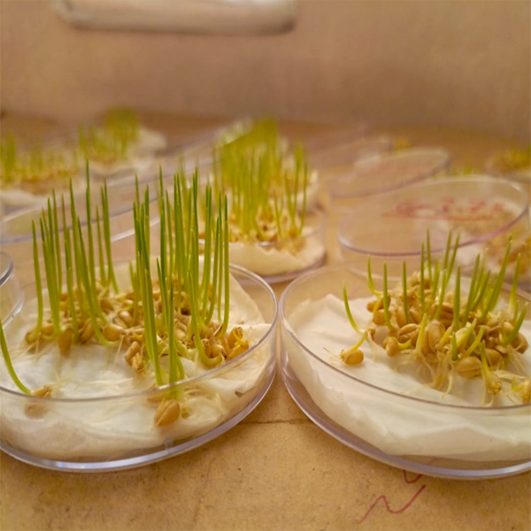 A lab experiment was carried out to investigate the role of ascorbic acid on wheat seedling drought stress induced by polyethylene glycol (PEG-6000) on some physiological traits and enzyme activity. The Wheat seeds were activated using ascorbic acid in four concentrations: 0, 25, 50 and 100 mg L-1. The germination medium was treated with PEG-6000 compound to achieve 0, -0.4, -0.8 and -1.2 bar tensions. The study's findings showed that the 50 mg L-1 ascorbic acid concentration provided the highest rates of wheat seed germination percentage; 99.2 %, root length; 12.30 cm, shoot length; 11.64 cm and relative water accounting for 84.75 %. Additionally, catalase and peroxidase enzymes increased most at the same ascorbic acid concentration. Also, the same concentration (50 mg L-1) improved the electrical conductivity of wheat seedling cells by recording the lowest rate of 3.53 dS/m. On the other hand, showed the lowest rates at high stress of PEG-6000 -1.2 bar when recording a germination percentage of 52.58 %, root length; 5.24 cm, shoot length; 5.79 cm and relative water content reached 56.32 %. In addition to causing the highest rise in enzymatic antioxidants for catalase and peroxidase, the same stress also had the highest rate of electrical conductivity, reaching 11.49 dS/m.