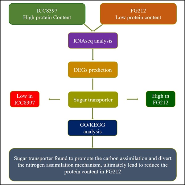 This study examines the impact of genes unique to sugar metabolism in regulating seed protein content by comparing them across two genotypes, FG212, 20 % (low protein content, LPC) and ICC8397, 30 % (high protein content, HPC) of (Cicer arietinum L.). Genes specific to sugar transport, which promote glycolysis and energy-intensive activities like development and stress responses, are more highly expressed in FG212 despite its low protein content. On the other hand, ICC8397 supports its high protein content by prioritising nitrogen assimilation over carbohydrate metabolism and by expressing more genes linked to nitrogen absorption, such as glutamine synthetase and nitrate reductase. The analysis revealed 17 sugar transport-specific genes, predominantly belonging to the SWEET family, with enhanced expression in FG212, these genes prioritise stress tolerance and glucose metabolism above protein synthesis. Gene ontology and KEGG pathway analysis revealed important biological processes such as hexose transport and carbohydrate metabolism, with genes related to energy balance and sugar distribution showing differential expression. While DNA repair proteins interacted with SWEET genes, suggesting their developmental significance, interaction studies showed that SWEET transporters and transcription factors such as MYB played important roles in stress. The findings of this research are useful in breeding new chickpea cultivars with enhanced SPC and higher nutritional values.