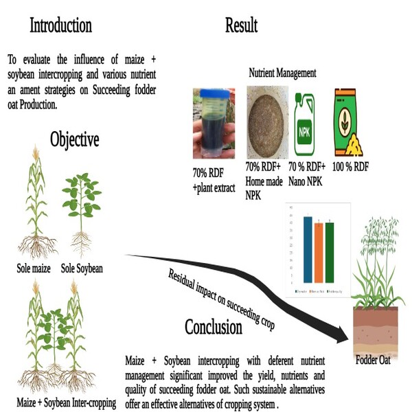 Residual effects of intercropping in maize-soybean systems on subsequent crop growth, yield and quality are highly significant. This study was conducted to evaluate the influence of maize + soybean intercropping and various nutrient management strategies on fodder oat (Avena sativa L.) production. The experiment, established at Lovely Professional University's agricultural research farm, utilized a split-plot design with three replications. Treatments comprised sole maize, sole soybean and maize-soybean intercrops at different row proportions, each combined with distinct nutrient sources. Results demonstrated that the residual effect of sole soybean as the preceding crop with 100 % RDF produced the most favorable outcomes across all measured parameters. This treatment enhanced plant height by 23.65 %, dry matter accumulation by 44.04 %, fodder quality by 40.0 % and biomass yield by 39.87 %, compared to other treatment combinations. Among nutrient management strategies, alternatives such as 70 % RDF combined with two foliar applications of nano-NPK, homemade NPK and plant extracts proved to be effective supplements to conventional fertilization. Correlation analyses revealed that biomass yield was strongly and positively linked to improvements in fodder oat quality and various crop growth parameters. This study indicates the potential of sustainable intercropping systems with optimized nutrient management to maximize agricultural resource use, reduce dependence on synthetic fertilizers and enhance fodder productivity. These findings support the adoption of more effective and environmentally friendly agricultural practices and contribute valuable insights toward addressing challenges in fodder production as well as soil health.