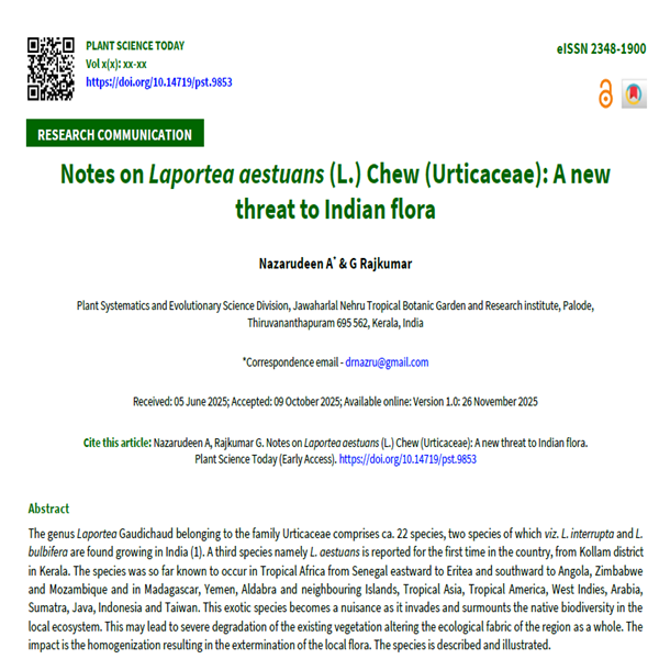 Plant Systematics and Evolutionary Science Division, Jawaharlal Nehru Tropical Botanic Garden and Research institute, Palode, Thiruvananthapuram 695 562, Kerala, India