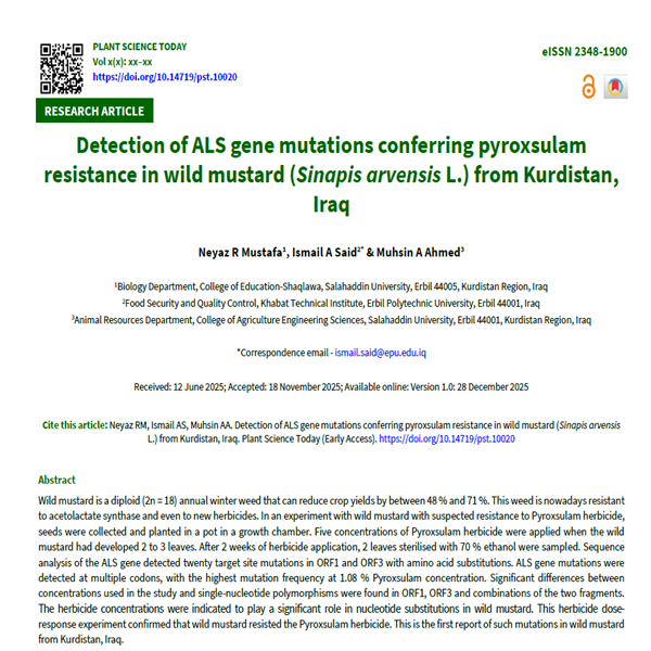 Wild mustard is a diploid (2n = 18) annual winter weed that can reduce crop yields by between 48 % and 71 %. This weed is nowadays resistant to acetolactate synthase and even to new herbicides. In an experiment with wild mustard with suspected resistance to Pyroxsulam herbicide, seeds were collected and planted in a pot in a growth chamber. Five concentrations of Pyroxsulam herbicide were applied when the wild mustard had developed 2 to 3 leaves. After 2 weeks of herbicide application, 2 leaves sterilised with 70 % ethanol were sampled. Sequence analysis of the ALS gene detected twenty target site mutations in ORF1 and ORF3 with amino acid substitutions. ALS gene mutations were detected at multiple codons, with the highest mutation frequency at 1.08 % Pyroxsulam concentration. Significant differences between concentrations used in the study and single-nucleotide polymorphisms were found in ORF1, ORF3 and combinations of the two fragments. The herbicide concentrations were indicated to play a significant role in nucleotide substitutions in wild mustard. This herbicide dose-response experiment confirmed that wild mustard resisted the Pyroxsulam herbicide. This is the first report of such mutations in wild mustard from Kurdistan, Iraq.