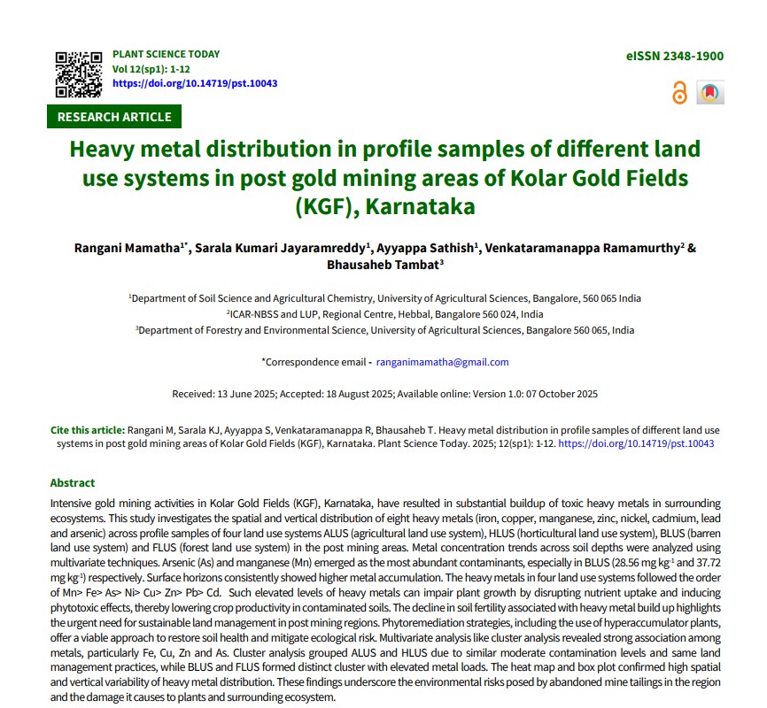Intensive gold mining activities in Kolar Gold Fields (KGF), Karnataka, have resulted in substantial buildup of toxic heavy metals in surrounding ecosystems. This study investigates the spatial and vertical distribution of eight heavy metals (iron, copper, manganese, zinc, nickel, cadmium, lead and arsenic) across profile samples of four land use systems ALUS (agricultural land use system), HLUS (horticultural land use system), BLUS (barren land use system) and FLUS (forest land use system) in the post mining areas. Metal concentration trends across soil depths were analyzed using multivariate techniques. Arsenic (As) and manganese (Mn) emerged as the most abundant contaminants, especially in BLUS (28.56 mg kg-1 and 37.72 mg kg-1) respectively. Surface horizons consistently showed higher metal accumulation. The heavy metals in four land use systems followed the order of Mn> Fe> As> Ni> Cu> Zn> Pb> Cd. Such elevated levels of heavy metals can impair plant growth by disrupting nutrient uptake and inducing phytotoxic effects, thereby lowering crop productivity in contaminated soils. The decline in soil fertility associated with heavy metal build up highlights the urgent need for sustainable land management in post mining regions. Phytoremediation strategies, including the use of hyperaccumulator plants, offer a viable approach to restore soil health and mitigate ecological risk. Multivariate analysis like cluster analysis revealed strong association among metals, particularly Fe, Cu, Zn and As. Cluster analysis grouped ALUS and HLUS due to similar moderate contamination levels and same land management practices, while BLUS and FLUS formed distinct cluster with elevated metal loads. The heat map and box plot confirmed high spatial and vertical variability of heavy metal distribution. These findings underscore the environmental risks posed by abandoned mine tailings in the region and the damage it causes to plants and surrounding ecosystem.