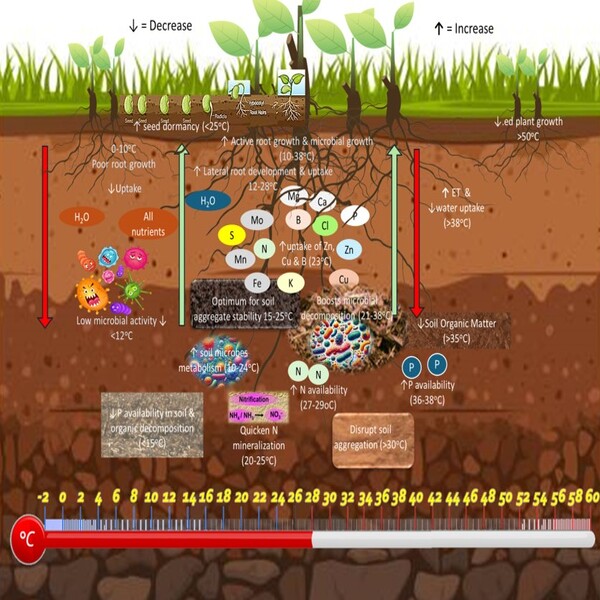 Soil temperature is a pivotal factor regulating physical, chemical and biological processes within terrestrial ecosystems, particularly in the rhizosphere where plant–soil interactions are most active. Fluctuations in soil temperature influence texture, structure, aeration and moisture retention, thereby altering nutrient mobility and availability. Temperature also affects key soil chemical properties such as pH, cation exchange capacity and the cycling of essential elements like carbon, nitrogen, phosphorus and potassium. Equally, microbial activity, which is central to decomposition, enzymatic reactions and nutrient mineralization is highly temperature-sensitive, with implications for soil fertility and ecosystem functioning. Furthermore, plant physiological functions including root development, nutrient uptake and photosynthesis are strongly modulated by soil thermal conditions. Extreme temperatures can impair crop performance, destabilize microbial processes and threaten food security. Unlike earlier reviews that examine these processes in isolation, this paper offers an integrated synthesis of how soil temperature governs multifaceted interactions across soil–plant systems. This review identifies critical research gaps, including the long-term impacts of thermal fluctuations on soil structure and productivity, the adaptability of microbial communities to sustained warming and the temperature sensitivity of nutrient transformations. It also underscores the need for precision monitoring of soil thermal regimes. Addressing these gaps is essential for developing adaptive, temperature-informed soil and crop management strategies. Ultimately, the review advances a systems-based understanding of soil temperature dynamics to support sustainable agriculture in a changing climate.