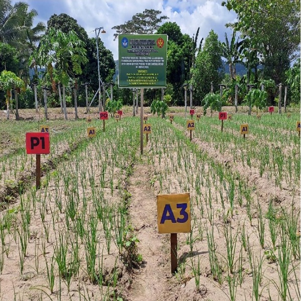 Shallot cultivation in dryland areas is often constrained by limited water availability and low soil fertility. Deficiencies in organic matter and essential nutrients, particularly nitrogen, phosphorus and potassium, hinder optimal plant growth. To enhance the success of shallot farming under such conditions, strategies to improve water availability and nutrient supply are required, including periodic irrigation and the application of site-specific fertilisers. This study aimed to evaluate the effects of different watering intervals and fertiliser types on the growth and productivity of shallots in dryland ecosystems, serving as a reference for good agricultural practices. The experiment was conducted in Bulupountu Village, Sigi Biromaru District, Sigi Regency, Central Sulawesi, from May 2023 to November 2023. A split-plot experimental design was employed, with watering interval as the main plot factor (T1: daily, T2: every two days, T3: every three days) and fertiliser type as the subplot factor (F0: no fertiliser/control, F1: organic fertiliser at recommended dose, F2: inorganic fertiliser at recommended dose). The agronomic performance observed was plant height, number of leaves per plant, number of tillers, bulb weight per clump and yield per hectare of shallot. The results demonstrated that both watering interval and fertiliser type significantly influenced shallot growth and yield. The combination of watering every two days and application of 5 t/ha organic fertiliser yielded the most favourable results, producing up to 6.20 t/ha of shallots. These findings suggest that optimising water and nutrient management is essential for improving shallot productivity in dryland agriculture.