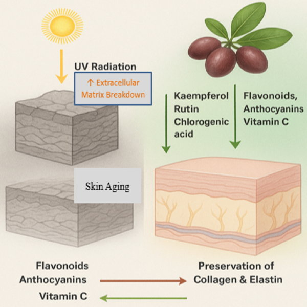 Oxidative damage to skin lipoproteins is a critical factor in ageing and dermatological disorders, yet natural interventions targeting this pathway remain insufficiently studied so plant-based cosmeceuticals of Carissa carandas L. extracts to protect skin lipoproteins from oxidative stress and ageing-related damage. Fully ripened fruits and leaves, dried in powder form, were subjected to ultrasound-assisted extraction with 50 % ethanol. Antioxidant and antimicrobial potential were determined. The yield of fruits and leaves extracts was obtained up to 43.30 and 25.00 %, respectively. Bioactives profiling was done by high-performance liquid chromatography (HPLC), quantify the presence of phenolic and flavonoids. Moreover, fruits extract displayed significant potential for total phenolic content, total flavonoid content (TFC) and total carotenoid content (TCC) compared to the leaves extract. Fruits formulation exhibited the highest 2,2-diphenyl-1-picrylhydrazyl (DPPH) inhibition (84.9 %) compared to the leaves formulation (76.5 %). In the ABTS (2,2′-azino-bis(3-ethylbenzothiazoline-6-sulfonic acid)) assay, fruit extract (76.90 %) and formulation (86.28 %) showed higher scavenging activity than leaves extract (60.38 %) and formulation (68.60 %). Fruits extract exhibited a larger antibacterial and antifungal zone of inhibition using Staphylococcus aureus & Escherichia coli, Aspergillus niger and Aspergillus flavus than the formulation. Antiaging activities were optimized by inhibition of antiaging enzymes, i.e. tyrosinase, collagenase and elastase. Fruits and leaves formulation inhibited all three enzymes, exhibiting the best anti-ageing effect. The findings suggested that C. carandas fruits and leaves extracts phenolic components may be used as an anti-ageing ingredient in cosmetics.