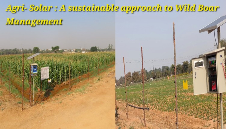 Wild boars (Sus scrofa) pose a severe threat to agriculture in Telangana, causing yield losses of 20-45 % in unprotected fields and significant economic loss to farmers. Traditional deterrents such as scarecrows, saree fencing and manual guarding have been largely ineffective, providing only 5-10 % reduction in crop damage. Field demonstrations of agri-solar fencing conducted from 2021 to 2023 across ten agro-ecological locations of Telangana revealed that treated plots recorded 0 % crop damage, while control plots showed an average of 29.1 % damage. Yields in treated fields were significantly higher: rice (8024 vs. 6800 kg/ha), maize (8025 vs. 1620 kg/ha in Nagarkurnool; 7506 vs. 4125 kg/ha in Rajendranagar), groundnut (3625 vs. 1120 kg/ha), red gram (2032 vs. 1450 kg/ha) and black gram (1504 vs. 800 kg/ha). The incremental cost-benefit ratio (ICBR) ranged from 1:0.98 in rice to 1:6.97 in groundnut, confirming the economic feasibility of the technology. Farmers also reported indirect benefits such as reduced labour, improved household security and less dependence on manual guarding. The study underscores agri-solar fencing as a sustainable, non-lethal and scalable solution for mitigating wildlife conflict and improving farm incomes in semi-arid regions of Telangana.