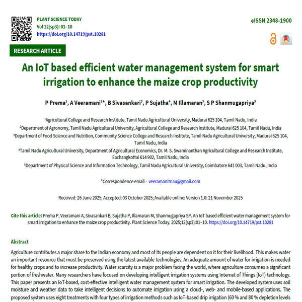 Agriculture contributes a major share to the Indian economy and most of its people are dependent on it for their livelihood. This makes water an important resource that must be preserved using the latest available technologies. An adequate amount of water for irrigation is needed for healthy crops and to increase productivity. Water scarcity is a major problem facing the world, where agriculture consumes a significant portion of freshwater. Many researchers have focused on developing intelligent irrigation systems using Internet of Things (IoT) technology. This paper presents an IoT-based, cost-effective intelligent water management system for smart irrigation. The developed system uses soil moisture and weather data to take intelligent decisions to automate irrigation using a cloud-, web- and mobile-based applications. The proposed system uses eight treatments with four types of irrigation methods such as IoT-based drip irrigation (60 % and 80 % depletion levels - T1 and T2); drip irrigation based on PE ratio (60 % and 80 % depletion levels - T3, T4 and normal practice T5); surface irrigation based on IW/CPE ratio (60 % and 80 % depletion levels - T6, T7) and flood irrigation (T8) are used. In all systems, water was applied at 60 % and 80 % depletion levels. This demonstrates the IoT- and cloud-based system enable precision agriculture by reducing human intervention in irrigation. The highest water saving was recorded in IoT-based drip irrigation at 60 % depletion level (46.88 %), followed by IoT-based drip irrigation at 80 % depletion level (40.63 %). Therefore, the proposed IoT-based drip irrigation system at 60 % depletion level can be recommended for hybrid maize to achieve higher grain and straw yields.