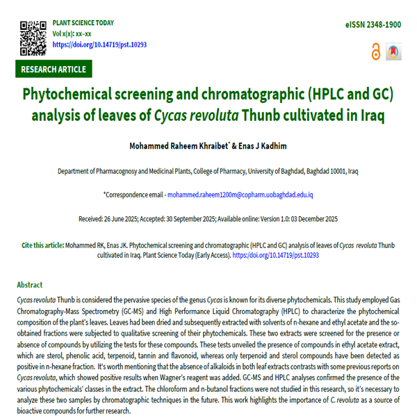Cycas revoluta Thunb is considered the pervasive species of the genus Cycas is known for its diverse phytochemicals. This study employed Gas Chromatography-Mass Spectrometry (GC-MS) and High Performance Liquid Chromatography (HPLC) to characterize the phytochemical composition of the plant’s leaves. Leaves had been dried and subsequently extracted with solvents of n-hexane and ethyl acetate and the so-obtained fractions were subjected to qualitative screening of their phytochemicals. These two extracts were screened for the presence or absence of compounds by utilizing the tests for these compounds. These tests unveiled the presence of compounds in ethyl acetate extract, which are sterol, phenolic acid, terpenoid, tannin and flavonoid, whereas only terpenoid and sterol compounds have been detected as positive in n-hexane fraction. It's worth mentioning that the absence of alkaloids in both leaf extracts contrasts with some previous reports on Cycas revoluta, which showed positive results when Wagner’s reagent was added. GC-MS and HPLC analyses confirmed the presence of the various phytochemicals’ classes in the extract. The chloroform and n-butanol fractions were not studied in this research, so it’s necessary to analyze these two samples by chromatographic techniques in the future. This work highlights the importance of C. revoluta as a source of bioactive compounds for further research.