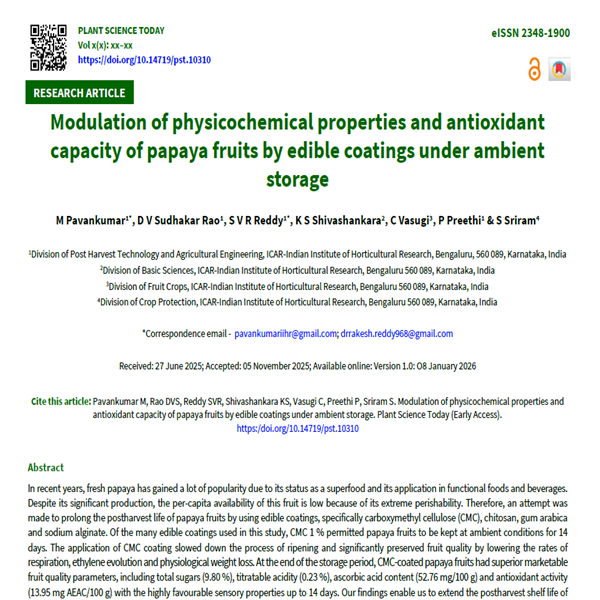 9. 9. Raju M, Mondal R, Valliath AS, Tejaswi S, Das P. Enhancement of quality parameters and shelf-life of papaya fruit (Carica papaya L.) by edible coating during storage and transportation. Development. 2023;9:10. https://doi.org/10.14719/pst.2024