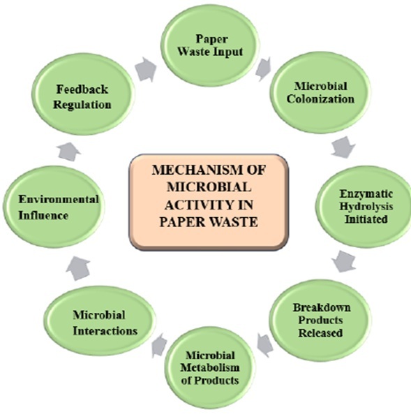 The pulp and paper industry generates huge amounts of solid and semi-solid waste, primarily in the form of sludge and fibrous residues, posing significant environmental and disposal challenges. This review provides a detailed overview of paper mill waste, emphasizing its physicochemical characteristics and the central role of microbial communities in degradation. Microorganisms, through diverse metabolic and enzymatic pathways, drive the breakdown of lignocellulosic materials such as cellulose, hemicellulose and lignin. Both abiotic and microbial degradation mechanisms are examined, with attention to key environmental factors- including temperature, pH, moisture and substrate composition- that influence the efficiency of biodegradation. The review also explores the advantages and limitations of microbial methods, highlighting the generation of valuable byproducts with potential environmental and commercial benefits. Further, it addresses the ecological and human health risks associated with improper paper waste disposal. This review concludes by evaluating current waste management and recycling approaches, while emphasizing strategies to enhance the efficiency and sustainability of paper waste biodegradation. Rooted in circular economy principles, it highlights the emerging role of microbial biotechnology in transforming paper mill waste into a resource of environmental and economic value and outlines key directions for future research.