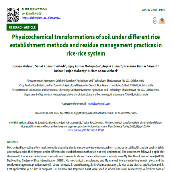 Mechanized harvesting often leads to residue burning due to narrow sowing windows, which harms both soil health and air quality. While alternatives exist, their impact under different rice establishment methods is not well understood. The experiment followed a split-plot design with four rice establishment methods and three replications. The establishment methods were M1: Wet Direct Seeded Rice (WDSR), M2: Modified System of Rice Intensification (MSRI), M3: mechanical transplanting and M4: manual line transplanting in main plots and the residue management practices were S1: straw removal, S2: open burning, S3: in-situ incorporation, S4: rice straw biochar application and S5: FYM application @ 5 t ha-1 in subplots. Cv. Swarna and Improved Lalat were used in Kharif and Rabi, respectively. A fertilizer dose of 80:40:40 kg ha-1 for Kharif and 60:30:30 kg ha-1 for Rabi rice was applied based on STBFR for medium N and low P and K soils. In MSRI, 50 % of N came from FYM (0.54 % N). Biochar addition improved bulk density, infiltration rate and water holding capacity. The MSRI method was very effective in improving the pH, EC, SOC and micronutrient status of the soil. Manual line planting was effective in maintaining the macronutrient (N, P and K) status of the soil. Straw incorporation was very effective in maintaining the overall soil health, including SOC, macronutrients and micronutrients. For improving the physical and chemical status of soil, modified SRI and FYM were the best practices.