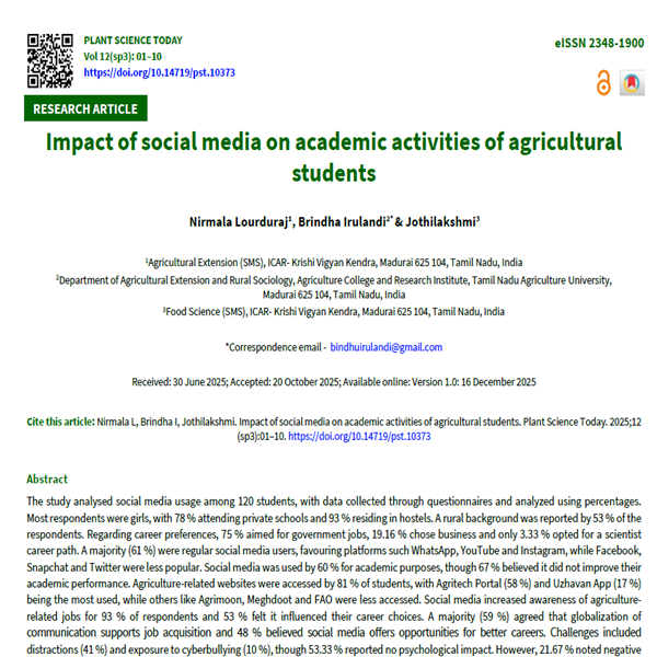 The study analysed social media usage among 120 students, with data collected through questionnaires and analyzed using percentages. Most respondents were girls, with 78 % attending private schools and 93 % residing in hostels. A rural background was reported by 53 % of the respondents. Regarding career preferences, 75 % aimed for government jobs, 19.16 % chose business and only 3.33 % opted for a scientist career path. A majority (61 %) were regular social media users, favouring platforms such WhatsApp, YouTube and Instagram, while Facebook, Snapchat and Twitter were less popular. Social media was used by 60 % for academic purposes, though 67 % believed it did not improve their academic performance. Agriculture-related websites were accessed by 81 % of students, with Agritech Portal (58 %) and Uzhavan App (17 %) being the most used, while others like Agrimoon, Meghdoot and FAO were less accessed. Social media increased awareness of agriculture-related jobs for 93 % of respondents and 53 % felt it influenced their career choices. A majority (59 %) agreed that globalization of communication supports job acquisition and 48 % believed social media offers opportunities for better careers. Challenges included distractions (41 %) and exposure to cyberbullying (10 %), though 53.33 % reported no psychological impact. However, 21.67 % noted negative psychological effects. To address these issues, 78 % suggested self-control, 93 % recommended time management and 44 % pointed to extracurricular activities. Key problems identified were addiction, distraction, overthinking and health-related issues. Students emphasized self-discipline and time management as solutions to these challenges. The findings indicate that while social media facilitated career awareness and academic engagement, its potential to distract from studies and cause psychological effects highlighted the importance of balanced usage and proper time management.