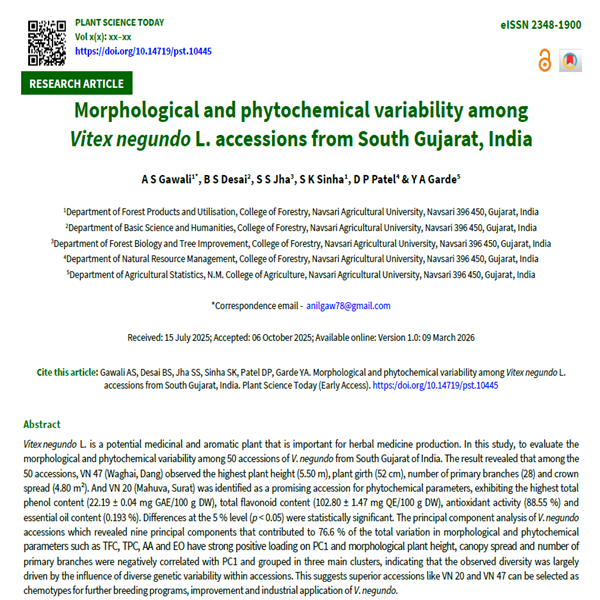 Vitex negundo L. is a potential medicinal and aromatic plant that is important for herbal medicine production. In this study, to evaluate the morphological and phytochemical variability among fifty accessions of V. negundo from South Gujarat of India. The result revealed that among the fifty accessions, VN 47 (Waghai, Dang) observed the highest plant height (5.50 m), plant girth (52 cm), number of primary branches (28) and crown spread (4.80 m²). And VN 20 (Mahuva, Surat) was identified as a promising accession for phytochemical parameters, exhibiting the highest Total Phenol Content (22.19 ± 0.04 mg GAE/100 g DW), Total Flavonoid Content (102.80 ± 1.47 mg QE/100 g DW), antioxidant activity (88.55 %) and essential oil content (0.193 %). Differences at the 5 % level (P < 0.05) were statistically significant. The principal component analysis of V. negundo accessions which revealed nine principal components that contributed to 76.6 % of the total variation in morphological and phytochemical parameters such as TFC, TPC, AA and EO have strong positive loading on PC1 and morphological plant height, canopy spread and number of primary branches were negatively correlated with PC1 and grouped in three main clusters, indicating that the observed diversity was largely driven by the influence of diverse genetic variability within accessions. This suggests superior accessions like VN 20 and VN 47 can be selected as chemotypes for further breeding programs, improvement and industrial application of V. negundo.