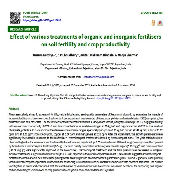 The present study aimed to assess soil fertility, yield attributes and seed quality parameters of Sesamum indicum L. by evaluating the impacts of inorganic fertiliser and vermicompost treatments. A pot experiment was executed utilising a completely randomised design (CRD) comprising five treatments and four replicates. The soil utilised for the experiment exhibited a sandy loam texture, a slightly alkaline pH of 8.5, negligible salinity with an electrical conductivity of 0.75 EC and low concentrations of available nitrogen at 75 kg ha-1 and organic carbon at 0.22 %. The levels of phosphate, potash, sulfur and micronutrients were within normal ranges, specifically phosphate at 23 kg ha-1, potash at 242 kg ha-1, sulfur at 22.72 ppm, zinc at 1.02 ppm, iron at 4.88 ppm, copper at 0.24 ppm and manganese at 2.28 ppm. After the experiment, the growth parameters were significantly increased in response to the biofertilizer + vermicompost treatment followed by vermicompost alone. The yield attributes were observed highest in the vermicompost treatment but results are not significant (p≥0.05 level) whereas 100 seed weight was significantly improved by biofertilizer + vermicompost treatment (0.34 g). The seed quality parameters including total soluble sugars (5.16 mg g-1) and protein content (192.69 mg g-1) were significantly improved in the biofertilizer + vermicompost treatment and the total phenols was decreased in inorganic fertilizer treatments. A significant amount of oil (45.2 %) was reported in the vermicompost treatment. These results suggest that vermicompost + biofertilizer combination is best for sesame plant growth, seed weight and seed biochemical parameters [Total Soluble Sugars (TSS) and protein] whereas vermicompost application is beneficial for enhancing yield attributes and oil content as compared with chemical fertilizers. The current investigation is novel and concluded that the combination of vermicompost and biofertiliser was more beneficial for enhancing soil organic carbon and nitrogen levels as well as crop productivity and yield in semi-arid conditions of Rajasthan.