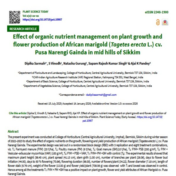 - 17. Choudhury S, Sarangi D, Mishra K. Response of integrated nutrient management on plant growth flower yield and shelf life of African marigold (Tagetes erecta L.) cv. Pusa Narangi Gainda. Int J Chem Stud. 2020;8(3):2453–6. https://doi.org/10.22271/chemi.2020.v8.i3ai.9577