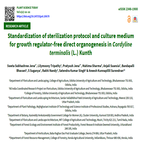 The study was conducted at the Biotechnology-cum-Tissue Culture Centre, Baramunda, AICRP of Floriculture and Landscaping, Odisha University of Agriculture and Technology, Bhubaneswar, India to standardize surface sterilization protocols and assess direct organogenesis in 3 explants-nodal segments, shoot tips and leaf bits under free plant growth regulators (PGR) conditions in Cordyline terminalis (L.) Kunth. Six sterilization treatments involving ethanol, sodium hypochlorite and mercuric chloride (HgCl₂) at varying concentrations and durations were evaluated. Among all, 0.1 % HgCl₂ for 10 min (T₈) was most effective, resulting in the highest survival (75.03 ± 0.17 %), minimal fungal (10.52 ± 0.16 %) and bacterial (0 %) contamination and maximum aseptic cultures (79.48 ± 0.14 %). Nodal segments consistently outperformed other explants in survival and regeneration. Subsequent culturing of nodal segments on MS basal medium devoid of PGRs resulted in direct shoot and root formation in all treatments (T₁–T₈), with T₈ showing maximum cultures with direct organogenesis (6.67), shoots (6.00/explant), leaves (9.00/shoot), root length (7.67 cm) and number of roots (5.33). Additionally, seasonal influence was significant for explants collected during the winter season (November-December) with higher survival and lower contamination compared to those from other months. The findings establish an efficient, hormone-free regeneration protocol for C. terminalis, emphasizing the importance of optimized sterilization and seasonal timing. This approach offers a simplified and cost-effective alternative for commercial micropropagation of C. terminalis.