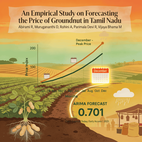Groundnut (Arachis hypogaea L.) or more popularly referred to as peanut, occupies a central role amongst the globe’s leading oilseed crops and India is one of the main producers. This research investigates the trends of groundnut farming, area, production and productivity in India and Tamil Nadu from 2005 to 2024. The purpose is to assess the volatility in groundnut farming and patterns of prices using statistical analysis like Cuddy-Della Valle Instability Index (CDVI), seasonal price index and Auto-Regressive Integrated Moving Average (ARIMA) model for forecasting prices. The findings indicate that the area under groundnut cultivation in India has decreased slightly, while production has remained steady and productivity has increased. This steadiness has factors like better seed varieties, improved agronomic methods and government support. In Tamil Nadu, though there was some reduction in area on account of drought and water shortages in certain places, such as Villupuram and Thiruvannamalai, there was an increase in production as a result of improved irrigation and cultivation methods. The time series and descriptive methods are employed to determine evident trends in production and price fluctuations. The Compound Annual Growth Rate (CAGR) methodology illustrates a moderate increase in production in spite of the decline in area, while the CDVI detects some instability at the times of droughts. The seasonal price index indicates that the prices go through a typical pattern, peaking in December due to a shortage of supply before the new harvest. ARIMA forecasting models demonstrate a satisfactory level of accuracy for the selected markets, which is a reliable tool for price prediction. The results reveal a valuable insight for farmers, traders and policymakers to take informed decisions regarding the production planning, strategies of storage and interventions in the market for the sustainable groundnut cultivation and to enhance the efficiency.