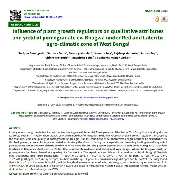 Pomegranates are grown in tropical and subtropical regions of the world. Pomegranate cultivation in West Bengal is expanding due to its drought-resistant nature, wider adaptability and suitability for marginal lands. The Potential of plant growth regulators in boosting the fruit size, yield and quality of pomegranate under agro-climatic conditions of southern West Bengal needs to be exploited. With this background, a research study was carried out to study the effect of plant growth regulators on flowering, fruiting as well as yield of pomegranate under the agro-climatic conditions of Bankura district. The present experiment was conducted during 2018-20 at four locations of Bankura district namely, Pathri, Bamunpathri, Damodarpur and Chhatna of West Bengal, where the Bhagwa variety of pomegranate had been planted at a spacing of 4.5 m × 4.5 m. The experiment was laid out in a randomized block design (RBD) with nine treatments and three replications: T1 - NAA @ 30 ppm, T2 – NAA @ 40 ppm, T3 - GA3 @ 75 ppm, T4 - GA3 @ 100 ppm, T5 - 2, 4-D @ 40 ppm, T6 - 2, 4-D @ 50 ppm, T7 – brassinolides @ 100 ppm, T8 – brassinolides @ 200 ppm and T9 - control. The study found that NAA at 40 ppm increased fruit yield, weight, length, diameter, number of arils, rind weight, juice content, sugar content and fruit diameter. GA3 at 30 ppm resulted in maximum flower buds, male flowers, hermaphrodite flowers, intermediate flowers, fruit diameter, rind thickness, fresh seed weight and TSS.