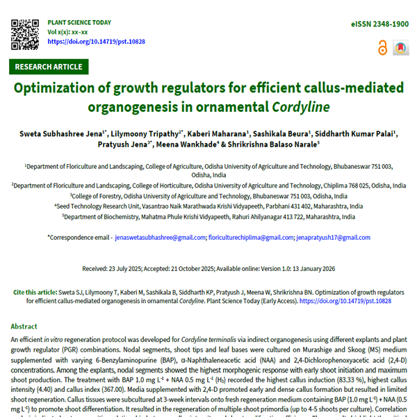 An efficient in vitro regeneration protocol was developed for Cordyline terminalis via indirect organogenesis using different explants and plant growth regulator (PGR) combinations. Nodal segments, shoot tips and leaf bases were cultured on Murashige and Skoog (MS) medium supplemented with varying 6-Benzylaminopurine (BAP), α-Naphthaleneacetic acid (NAA) and 2,4-Dichlorophenoxyacetic acid (2,4-D) concentrations. Among the explants, nodal segments showed the highest morphogenic response with early shoot initiation and maximum shoot production. The treatment with BAP 1.0 mg L-1 + NAA 0.5 mg L-1 (H3) recorded the highest callus induction (83.33 %), highest callus intensity (4.40) and callus index (367.00). Media supplemented with 2,4-D promoted early and dense callus formation but resulted in limited shoot regeneration. Callus tissues were subcultured at 3-week intervals onto fresh regeneration medium containing BAP (1.0 mg L-1) + NAA (0.5 mg L-1) to promote shoot differentiation. It resulted in the regeneration of multiple shoot primordia (up to 4-5 shoots per culture). Correlation analysis indicated a strong positive relationship between callus intensity and shoot proliferation efficiency. These results highlight the critical role of explant selection and hormonal balance in optimizing callus-mediated regeneration. The standardized protocol developed in this study can be effectively utilized for the large-scale propagation and conservation of Cordyline terminalis.