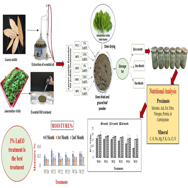 Amaranthus viridis L. (Family: Amaranthaceae) is a nutritious leafy vegetable known for its rich carbohydrates, proteins, moisture, fat and dietary fiber content. However, due to their high-water content and ongoing biological activity, this leafy vegetable is prone to post-harvest deterioration caused by mechanical damage, biochemical changes, aging and microbial contamination. Proper preservation techniques are therefore crucial to maintain their freshness, nutritional value and marketability. Drying is a widely used method that reduces the moisture content and delays the spoilage of vegetables. In recent years, essential oils (EO) have emerged as effective natural preservatives due to their antimicrobial and antioxidant properties. For instance, EO from Laurus nobilis L. (bay leaf) has demonstrated antimicrobial activity against bacteria that cause food spoilage, thereby promoting food safety and sustainable, health-conscious consumption. However, the specific effect of L. nobilis EO (LnEO) on the retention of the nutritional composition and antioxidant activities of leafy vegetables, including A. viridis, has not yet been reported. Hence, in the present study, the influences of different concentrations (1 %, 1.5 %, 2 %, 2.5 % and 3 %) of L. nobilis LnEO on oven-dried A. viridis were evaluated in terms of nutritional and antioxidant activities over a storage period of up to two months (60 days). Results indicated that the 3 % LnEO treatment was the most effective, maintaining the highest levels of crude fiber, nitrogen, protein, fat, carbohydrates, antioxidants and minerals even after 60 days. These findings suggest that using 3 % EO in oven-dried A. viridis significantly enhances post-harvest nutrient retention. This will provide valuable information for researchers, development partners and farmers engaged in both subsistence and commercial agriculture to support food security and easier market access in rural communities.