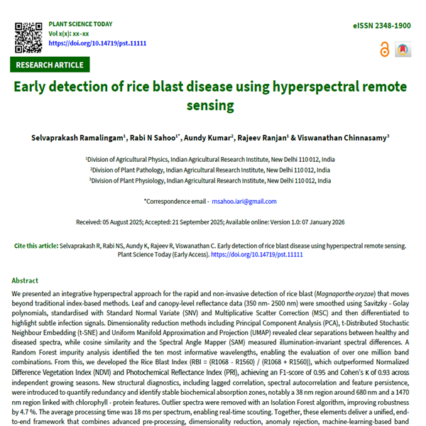 - 5. Mandal N, Adak S, Das DK, Sahoo RN, Mukherjee J, Kumar A, et al. Spectral characterization and severity assessment of rice blast disease using univariate and multivariate models. Front Plant Sci. 2023;14:1067189. https://doi.org/10.3389/fpls.2023.1067189