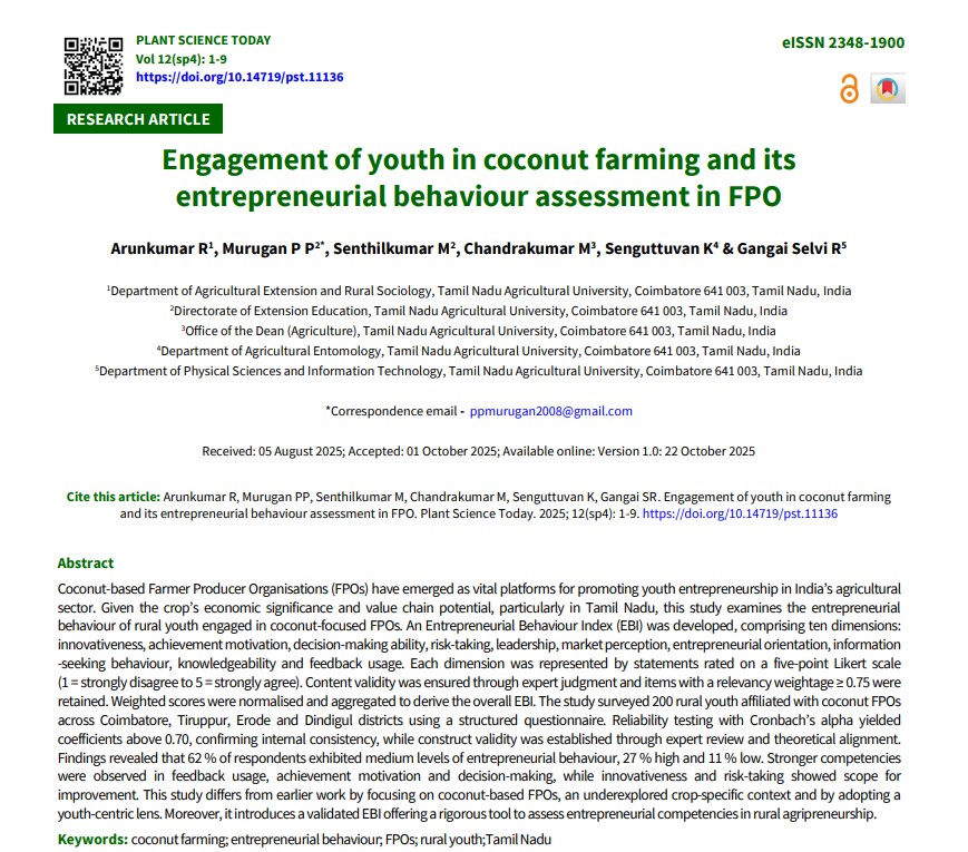 Coconut-based Farmer Producer Organisations (FPOs) have emerged as vital platforms for promoting youth entrepreneurship in India’s agricultural sector. Given the crop’s economic significance and value chain potential, particularly in Tamil Nadu, this study examines the entrepreneurial behaviour of rural youth engaged in coconut-focused FPOs. An Entrepreneurial Behaviour Index (EBI) was developed, comprising ten dimensions: innovativeness, achievement motivation, decision-making ability, risk-taking, leadership, market perception, entrepreneurial orientation, information-seeking behaviour, knowledgeability and feedback usage. Each dimension was represented by statements rated on a five-point Likert scale (1 = strongly disagree to 5 = strongly agree). Content validity was ensured through expert judgment and items with a relevancy weightage ≥ 0.75 were retained. Weighted scores were normalised and aggregated to derive the overall EBI. The study surveyed 200 rural youth affiliated with coconut FPOs across Coimbatore, Tiruppur, Erode and Dindigul districts using a structured questionnaire. Reliability testing with Cronbach’s alpha yielded coefficients above 0.70, confirming internal consistency, while construct validity was established through expert review and theoretical alignment. Findings revealed that 62 % of respondents exhibited medium levels of entrepreneurial behaviour, 27 % high and 11 % low. Stronger competencies were observed in feedback usage, achievement motivation and decision-making, while innovativeness and risk-taking showed scope for improvement. This study differs from earlier work by focusing on coconut-based FPOs, an underexplored crop-specific context and by adopting a youth-centric lens. Moreover, it introduces a validated EBI offering a rigorous tool to assess entrepreneurial competencies in rural agripreneurship.