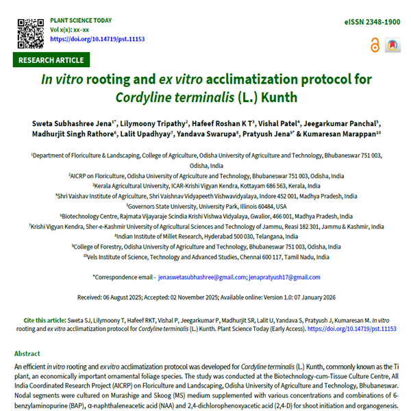 An efficient in vitro rooting and ex vitro acclimatization protocol was developed for Cordyline terminalis (L.) Kunth, commonly known as the Ti plant, an economically important ornamental foliage species. The study was conducted at the Biotechnology-cum-Tissue Culture Centre, All India Coordinated Research Project (AICRP) on Floriculture and Landscaping, Odisha University of Agriculture and Technology, Bhubaneswar. Nodal segments were cultured on Murashige and Skoog (MS) medium supplemented with various concentrations and combinations of 6-benzylaminopurine (BAP), α-naphthaleneacetic acid (NAA) and 2,4-dichlorophenoxyacetic acid (2,4-D) for shoot initiation and organogenesis. Among the combinations tested, BAP (1.0 mg L-1) and NAA (0.5 mg L-1) induced the highest shoot proliferation and morphogenetic response. For rooting, both in vitro and ex vitro approaches were evaluated. In vitro rooting was achieved on plant growth regulator (PGR)-free half-strength MS medium, while ex vitro rooting was optimized using quick dips in indole-3-butyric acid (IBA) at 25 ppm, which yielded the highest rooting percentage (96.6 %), root number (3.6) and root length (3.90 cm) in potting mixture. Hardening was performed under open conditions, plastic cover and net house environments using various substrates. The highest survival (40 %) was recorded in the net house using a vermiculite + sand substrate, which although moderate, represented the most effective survival outcome under tropical field conditions. Additionally, nutritional standardization trials revealed that soil drenching with nitrogen-phosphorus-potassium (NPK) (19:19:19) at 0.75 g plant-1 significantly improved plant height and leaf number, while foliar application enhanced leaf length and breadth. This comprehensive protocol demonstrates the potential for mass propagation of C. terminalis with high rooting efficiency and improved survival rate. The findings provide a practical, reproducible and cost-effective strategy for sustainable micropropagation and commercial-scale cultivation of this valuable ornamental species.