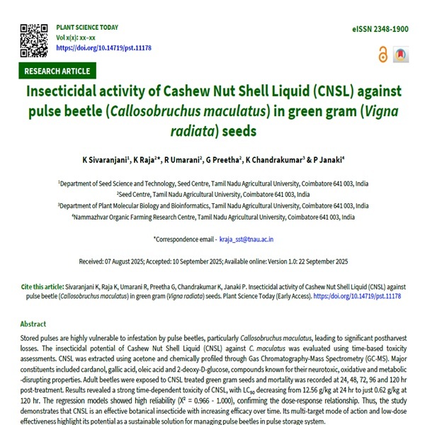 6. 6. Jaiswal DK, Raju SVS, Choudhary S, Kumar S, Vani VM. Bioefficacy of physical, chemical and bio-pesticide seed treatment against pulse beetle (Callosobruchus chinensis) in chickpea. Indian J Agric Res. 2024. https://doi.org/10.18805/IJARe.A-6266