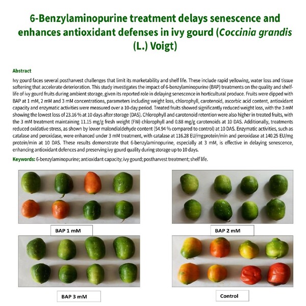 Ivy gourd faces several postharvest challenges that limit its marketability and shelf life. These include rapid yellowing, water loss and tissue softening that accelerate deterioration. This study investigates the impact of 6-benzylaminopurine (BAP) treatments on the quality and shelf-life of ivy gourd fruits during ambient storage, given its reported role in delaying senescence in horticultural produce. Fruits were dipped with BAP at 1 mM, 2 mM and 3 mM concentrations, parameters including weight loss, chlorophyll, carotenoid, ascorbic acid content, antioxidant capacity and enzymatic activities were measured over a 10-day period. Treated fruits showed significantly reduced weight loss, with the 3 mM showing the lowest loss of 23.16 % at 10 days after storage (DAS). Chlorophyll and carotenoid retention were also higher in treated fruits, with the 3 mM treatment maintaining 11.15 mg/g fresh weight (FW) chlorophyll and 0.88 mg/g carotenoids at 10 DAS. Additionally, treatments reduced oxidative stress, as shown by lower malondialdehyde content (54.94 % compared to control) at 10 DAS. Enzymatic activities, such as catalase and peroxidase, were enhanced under 3 mM treatment, with catalase at 116.28 EU/mg protein/min and peroxidase at 140.25 EU/mg protein/min at 10 DAS. These results demonstrate that 6-benzylaminopurine, especially at 3 mM, is effective in delaying senescence, enhancing antioxidant defences and preserving ivy gourd quality during storage up to 10 days.
