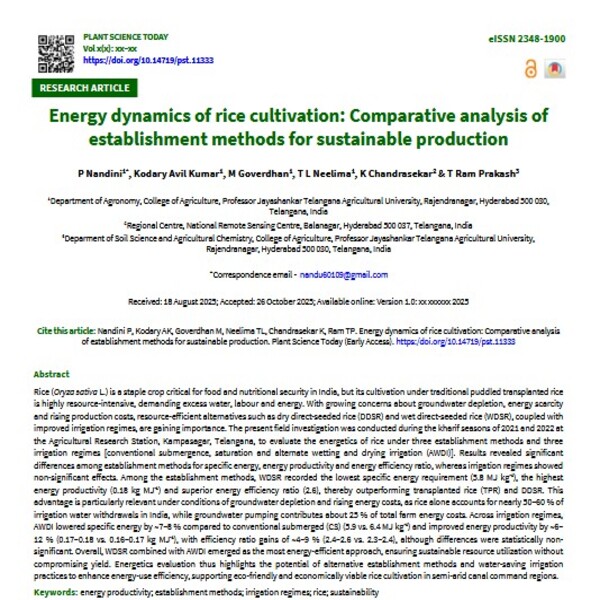 Rice (Oryza sativa L.) is a staple crop critical for food and nutritional security in India, but its cultivation under traditional puddled transplanted rice is highly resource-intensive, demanding excess water, labour and energy. With growing concerns about groundwater depletion, energy scarcity and rising production costs, resource-efficient alternatives such as dry direct-seeded rice (DDSR) and wet direct-seeded rice (WDSR), coupled with improved irrigation regimes, are gaining importance. The present field investigation was conducted during the kharif seasons of 2021 and 2022 at the Agricultural Research Station, Kampasagar, Telangana, to evaluate the energetics of rice under three establishment methods and three irrigation regimes [conventional submergence, saturation and alternate wetting and drying irrigation (AWDI)]. Results revealed significant differences among establishment methods for specific energy, energy productivity and energy efficiency ratio, whereas irrigation regimes showed non-significant effects. Among the establishment methods, WDSR recorded the lowest specific energy requirement (5.8 MJ kg-1), the highest energy productivity (0.18 kg MJ-1) and superior energy efficiency ratio (2.6), thereby outperforming transplanted rice (TPR) and DDSR. This advantage is particularly relevant under conditions of groundwater depletion and rising energy costs, as rice alone accounts for nearly 50–60 % of irrigation water withdrawals in India, while groundwater pumping contributes about 25 % of total farm energy costs. Across irrigation regimes, AWDI lowered specific energy by ~7–8 % compared to conventional submerged (CS) (5.9 vs. 6.4 MJ kg-1) and improved energy productivity by ~6–12 % (0.17–0.18 vs. 0.16–0.17 kg MJ-1), with efficiency ratio gains of ~4–9 % (2.4–2.6 vs. 2.3–2.4), although differences were statistically non-significant. Overall, WDSR combined with AWDI emerged as the most energy-efficient approach, ensuring sustainable resource utilization without compromising yield. Energetics evaluation thus highlights the potential of alternative establishment methods and water-saving irrigation practices to enhance energy-use efficiency, supporting eco-friendly and economically viable rice cultivation in semi-arid canal command regions.