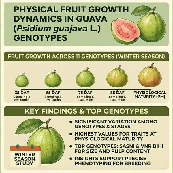 Guava (Psidium guajava L.) is a widely cultivated tropical fruit crop valued for its nutritional richness, adaptability and economic importance. This study aimed to investigate the developmental progression of key fruit traits across eleven diverse guava genotypes during the winter season. Fruits were sampled at five growth stages, i.e. 35, 65, 75, 85 days after flowering (DAF) and at physiological maturity (PM) and were evaluated for fruit weight, length, width, seed core diameter and pulp thickness. Significant variation (p ≤ 0.05) was observed among genotypes and across stages for all traits, with the highest values occurring at the PM stage. Genotypes such as Sasni and VNR Bihi recorded the highest values for various fruit physical traits, making them good material for breeding programs focused on fruit size and pulp content. Principal Component Analysis (PCA) revealed that the first three components accounted for 79.46 % of the total variability among genotypes. PC1 (48.97 %) was primarily associated with fruit weight, diameter and seed core diameter at later stages. PC2 (16.15 %) reflected variation in pulp thickness and seed core diameter at mid stages, while PC3 (14.34 %) captured additional differences in fruit length and pulp thickness at maturity. This study provides insights into stage-wise fruit development, enabling future researchers to identify the most appropriate growth stages for recording key fruit traits. These insights will support precise phenotyping and strengthen selection decisions in guava breeding and improvement programs.