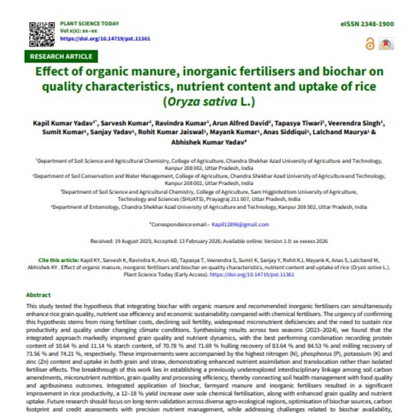 This study tested the hypothesis that integrating biochar with organic manure and recommended inorganic fertilisers can simultaneously enhance rice grain quality, nutrient use efficiency and economic sustainability compared with chemical fertilisers. The urgency of confirming this hypothesis stems from rising fertiliser costs, declining soil fertility, widespread micronutrient deficiencies and the need to sustain rice productivity and quality under changing climate conditions. Synthesising results across two seasons (2023–2024), we found that the integrated approach markedly improved grain quality and nutrient dynamics, with the best performing combination recording protein content of 10.64 % and 11.14 % starch content, of 70.78 % and 71.69 % hulling recovery of 83.64 % and 84.53 % and milling recovery of 73.56 % and 74.21 %, respectively. These improvements were accompanied by the highest nitrogen (N), phosphorus (P), potassium (K) and zinc (Zn) content and uptake in both grain and straw, demonstrating enhanced nutrient assimilation and translocation rather than isolated fertiliser effects. The breakthrough of this work lies in establishing a previously underexplored interdisciplinary linkage among soil carbon amendments, micronutrient nutrition, grain quality and processing efficiency, thereby connecting soil health management with food quality and agribusiness outcomes. Integrated application of biochar, farmyard manure and inorganic fertilisers resulted in a significant improvement in rice productivity, a 12–18 % yield increase over sole chemical fertilisation, along with enhanced grain quality and nutrient uptake. Future research should focus on long-term validation across diverse agro-ecological regions, optimisation of biochar sources, carbon footprint and credit assessments with precision nutrient management, while addressing challenges related to biochar availability, standardisation and farmer adoption.